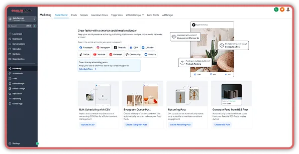 Run ads, email/SMS campaigns, social scheduling, and performance tracking from one dashboard.